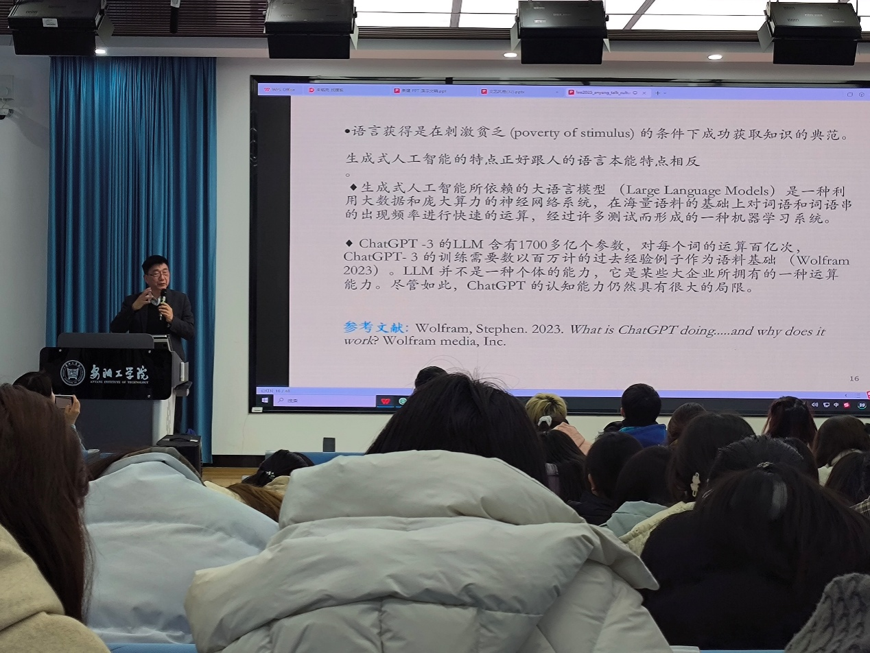 李行德教授从语言学角度分析了生成式人工智能对文化传播工作形成的挑战,提出外语学习者应不忘初心,坚持阅读经典著作、勤于写作,提高元语言认知来应对挑战。