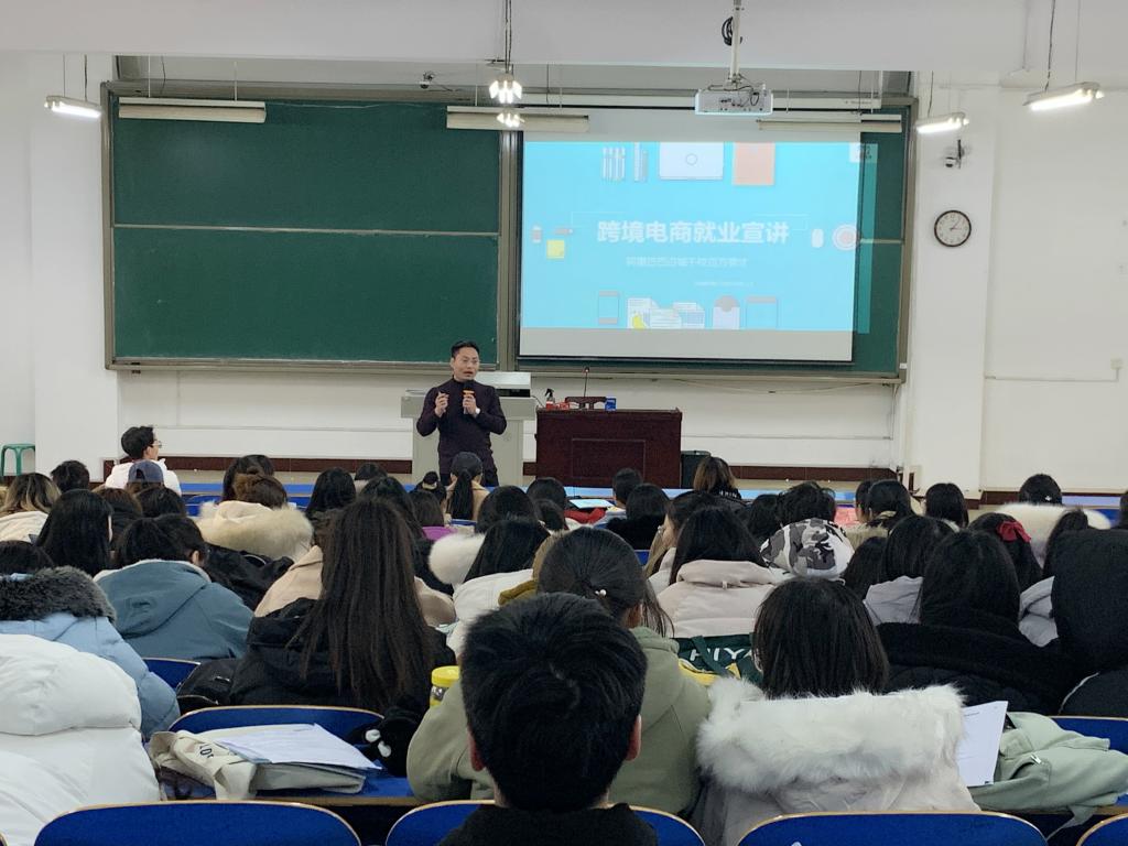 首先,河南澳得电商总经理杨高飞为学生分析了后疫情时代跨境电子商务的发展现状及趋势,介绍了从事跨境电商的路径和方法,并详细讲解了毕业生在求职前需要做的准备,鼓励大家调整好心态,抓住就业机会,积极主动去求职。