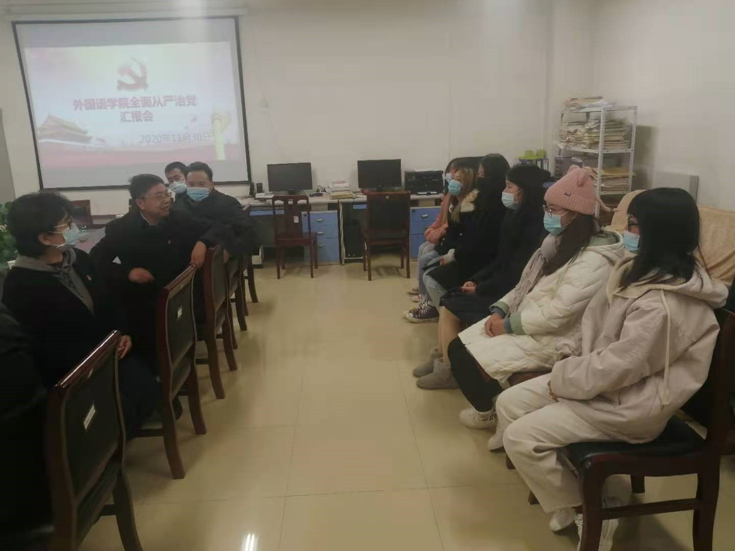11月30日下午,副校长万鹏杰到taptap点点官方网站调研指导全面从严治党工作,并与所联系的党支部和班级师生代表进行座谈。汇报座谈会在A10-201进行,taptap点点官方网站领导班子成员、英语教研室党支部全体党员、20级英语专业2班学生代表等30余人参加会议。