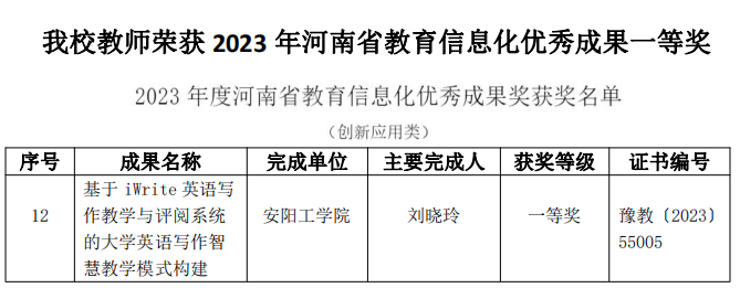 近日,河南省教育厅公布了2023年度河南省教育信息化优秀成果奖获奖名单,我校taptap点点官方网站教师刘晓玲获得教育信息化“创新应用类”优秀成果一等奖。